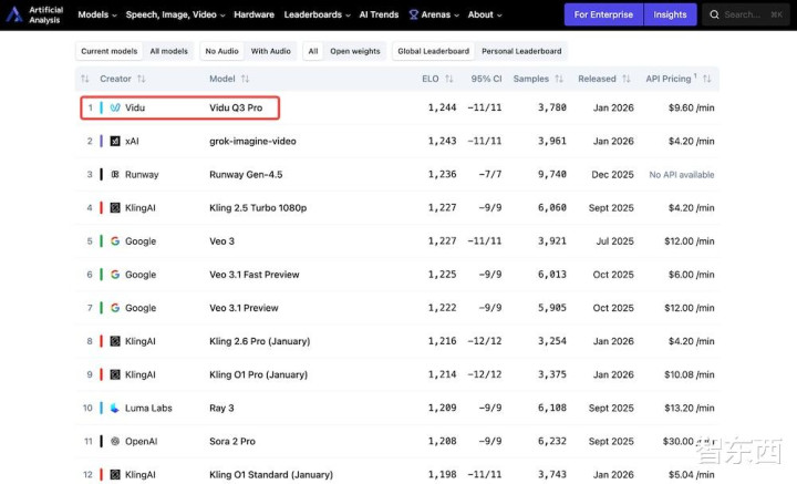 与此同期,另一款国产视频生成模子生数科技的Vidu Q3,也在创作家社群中走红,并刚刚登顶各人泰斗AI评测平台Artificial Analysis,成为各人名依次一的视频生成模子。